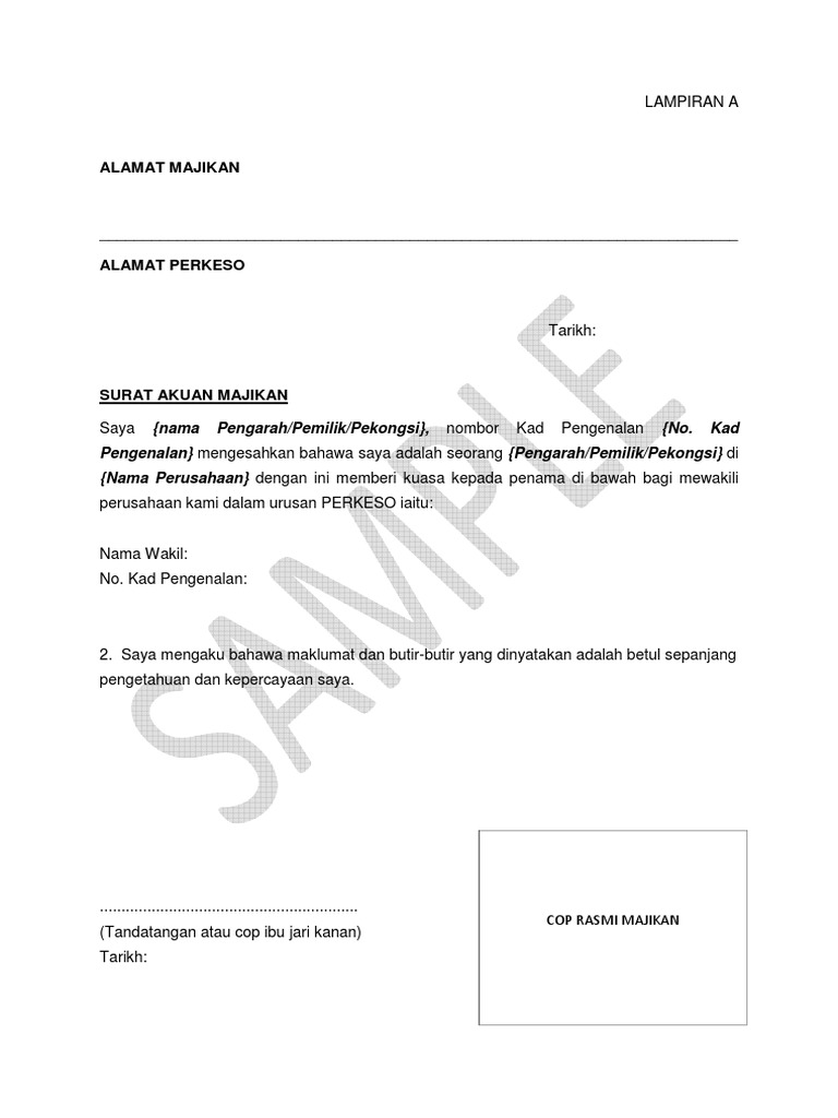 Contoh surat kuasa wakil majikan contoh jul. Jika anda mencari contoh surat kuasa wakil majikan maka anda berada di tempat yang tepat blog contohkaro memiliki banyak koleksi gambar seperti contoh surat kuasa wakil majikan gambar ini tersedia dalam format jpg png gif. To find out more complete and clear information or images, you can visit. 5 4 surat kuasa perwakilan syarikat. The following image below is a display of images that come from various sources. Maklumat pegawai adalah seperti berikut: (hendaklah menyatakan nama wakil, no.kpp, jawatan dan tarikh wakil mula berkhidmat dengan syarikat tersebut) tandatangan wakil: Surat wakil majikan perkeso perkeso borang 8a form. Pasir mk 18 83400 sri medan batu pahat johor. Surat pengesahan pekerja xx nama xx nama syarikat alamat no tel. Contoh surat kuasa wakil majikan miharu hime. We provide image contoh surat wakil kuasa lhdn is similar, because our website concentrate on this category, users can find their way easily and we show a simple theme to search for images. Saya _____ selaku majikan/ pengarah/ pengurus bagi syarikat di atas dengan ini mengakui bahawa kesemua keterangan bagi maksud permohonan ini adalah benar.